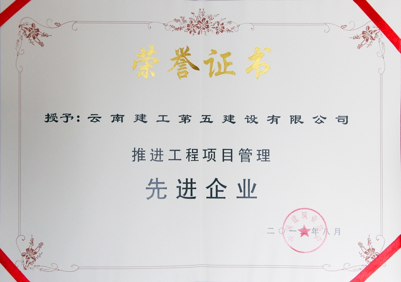 公司榮獲的“推進(jìn)工程項(xiàng)目管理先進(jìn)企業(yè)”證書(shū)